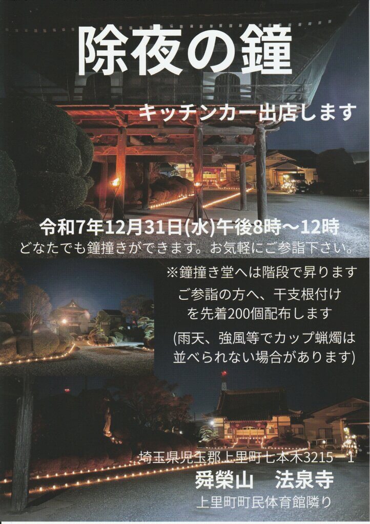 31日(水)除夜の鐘 20:00~24:00 どなたでも鐘撞きできます。お気軽にご参詣下さい。